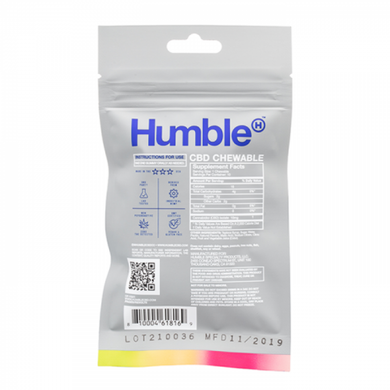 Humble CBD ChewablesBrand:Humble CBDUnit: setType:CBD EdiblesNet Weight: 55(g)The combined shipping cost will be calculated automatically by the system after you choose the shipping destination in the checkout step.Humble CBD Chewables INTRODUCTIONHumble CBD Chewables contains pure CBD without the additional cannabinoid or terpenes, which is isolated CBD and THC free. It provides access to both ra..